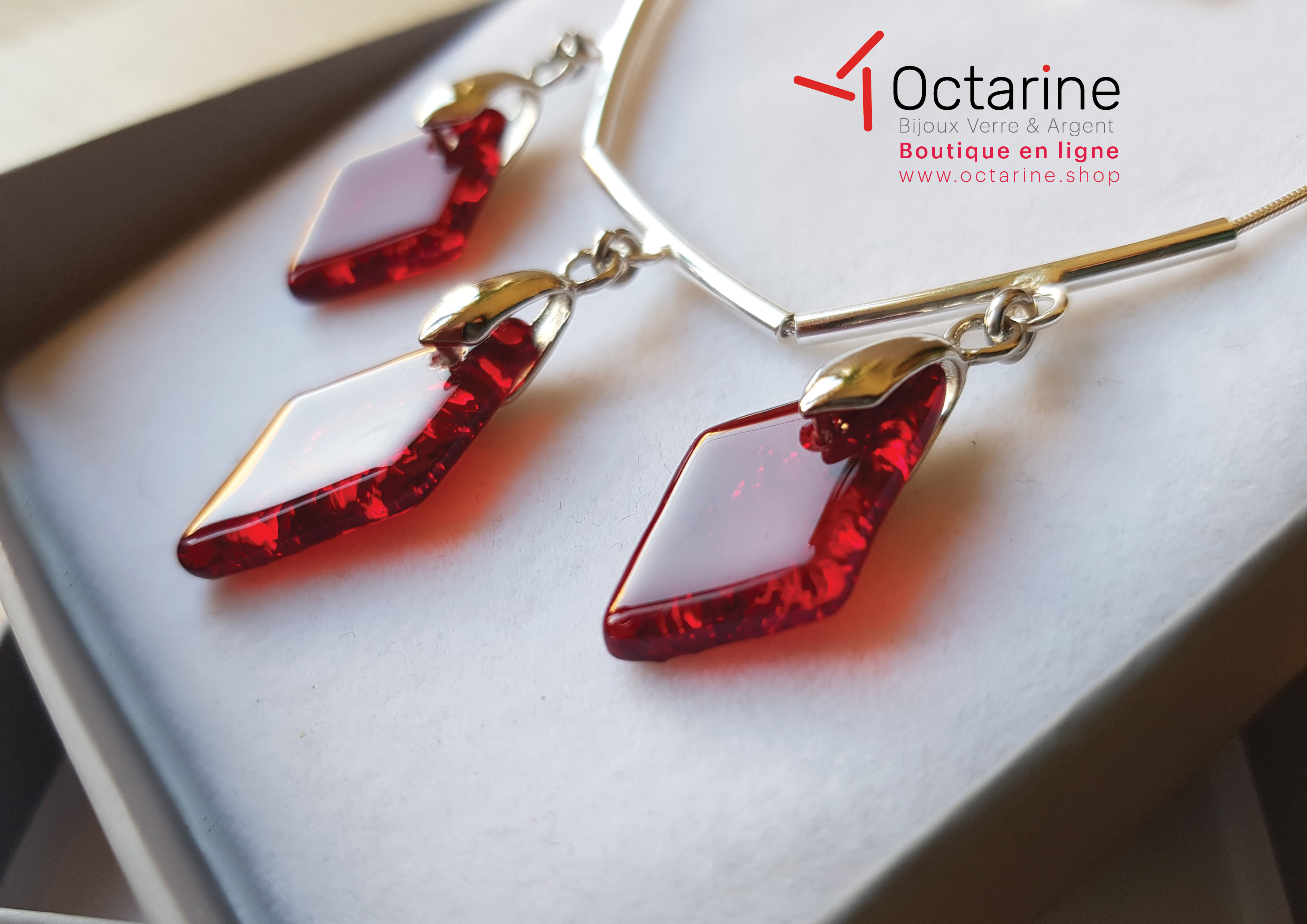 Chaîne serpent en argent 925, losange en verre de vitrail rouge. Extention pour réglage de 40 cm à 45 cm. 65€